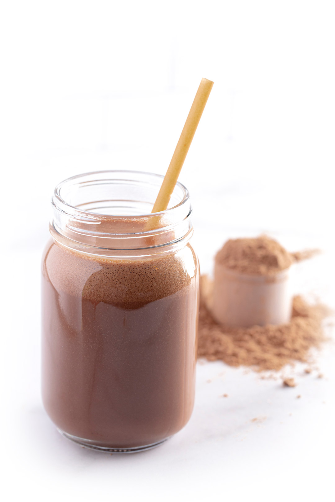 Mix two scoops into a smoothie or water. Try our High Protein Chocolate Smoothie recipe below: Blend 2 scoops of protein powder, 1 frozen banana, 2 tbsp of almond butter, 1 handful of spinach, 1 - 1.5 cups of your preferred milk.